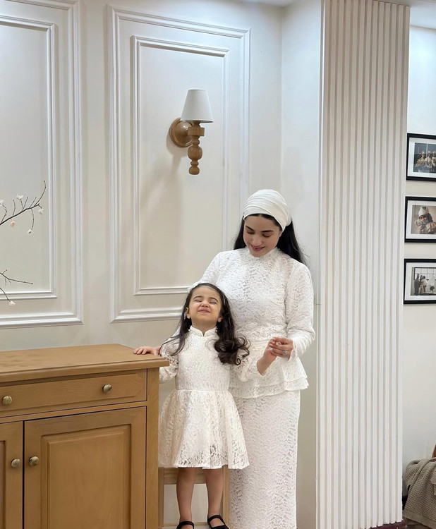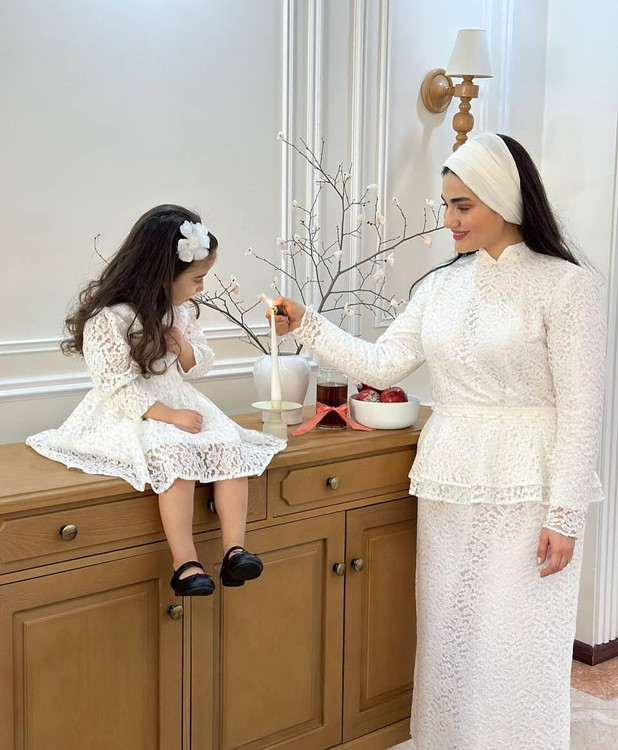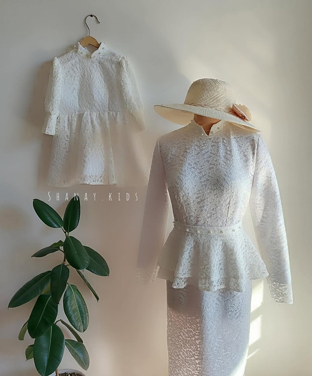 پیراهن مادر یه تیکه و بلند هست و قسمت کلوش روی کمر جدا میشه